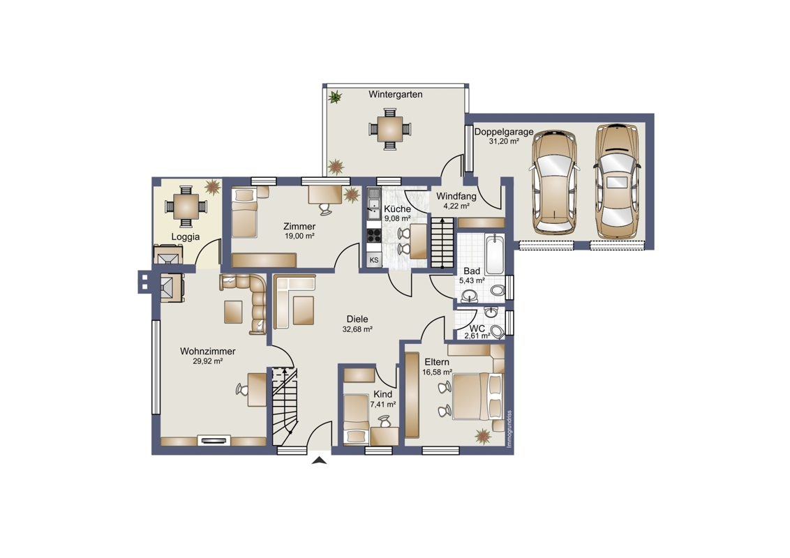 Eingangsbereich, Diele, Duschbad, Gäste-WC, Schlafzimmer, Büro, Gästezimmer, Wohnzimmer, Wintergarten, Küche, Hauswirtschaftsraum.