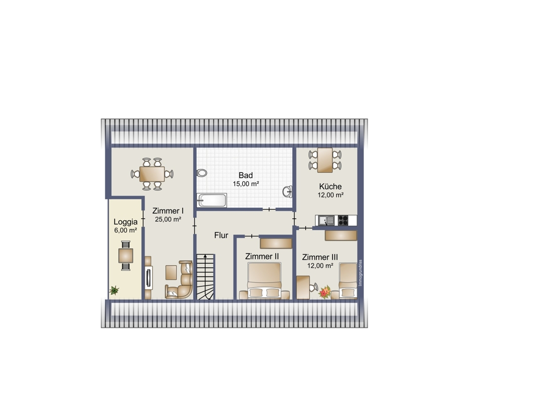In der Einliegerwohnung im Dachgeschoss befinden sich folgende Räume: